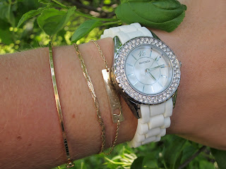 So today was the first day I have worn my new white watch. For some reason I thought it went with the semi-nautical themed outfit I am wearing to the office. Aside from the dream watch, a white Chanel diamond encrusted one; I also want to finally find the perfect boyfriend gold watch. I am thinking this Marc Jacobs watch would fit the bill. For around $250 it’s not that out of reach either.